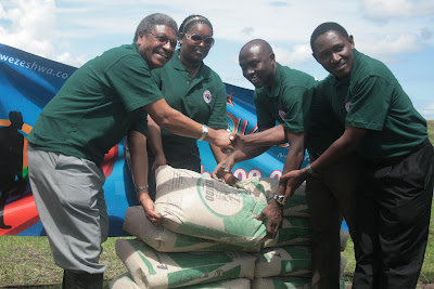 Meneja wa Kiwanda cha Bia Tanzania (TBL) Mkoa wa Mbeya Calvin Martin (kulia) akimkabidhi Mkuu wa Mkoa wa Mbeya Abbas Kandoro sehemu ya mifuko ya saruji kati ya 200 yenye thamani ya sh.milioni 3,iliyotolewa na kiwanda hicho juzi kwa ajili ya ujenzi wa madarasa ya shule mbalimbali mkoani humo.Wa pili kutoka kushoto ni Meneja Uhusiano na Mawasiliano wa TBL Edith Mushi na Meneja Mauzo na Usambazi wa TBL Kanda ya Kusini, James Kavuma.